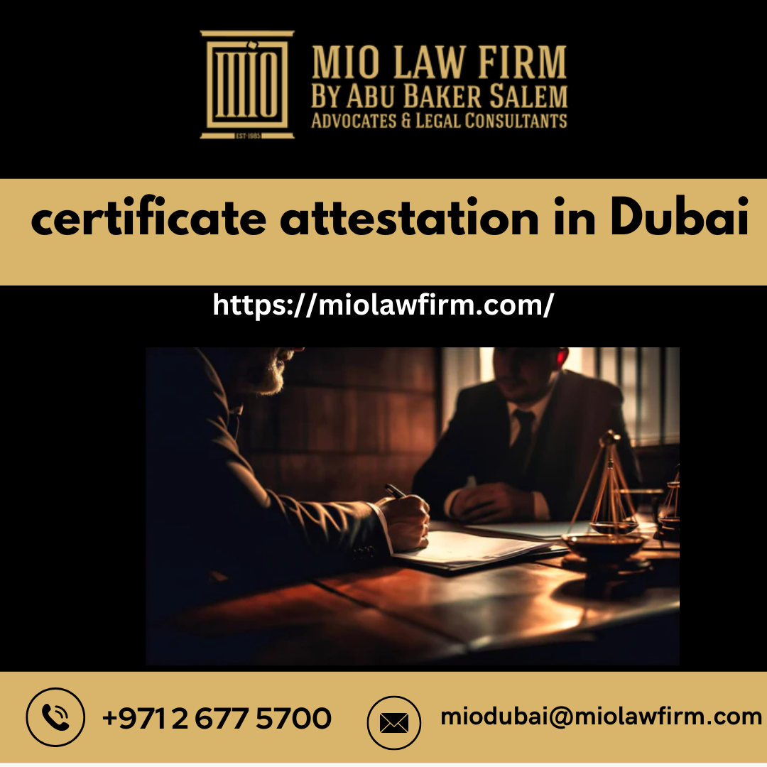 Miolawfirm offers efficient certificate attestation services in Dubai, simplifying the process for individuals and businesses. Our experienced team handles attestation procedures for various documents, including educational certificates, marriage certificates, and commercial documents. We liaise with relevant authorities and embassies to ensure that your documents are legally recognized and accepted internationally. Whether you're applying for visas, pursuing education or employment abroad, our certificate attestation services streamline the process and save you time and effort. Trust Miolawfirm for reliable and timely certificate attestation services that meet your legal and regulatory requirements seamlessly. Experience hassle-free attestation with Miolawfirm in Dubai.For more information follow the link https://miolawfirm.com/pages/certificate-attestation-services-in-dubai